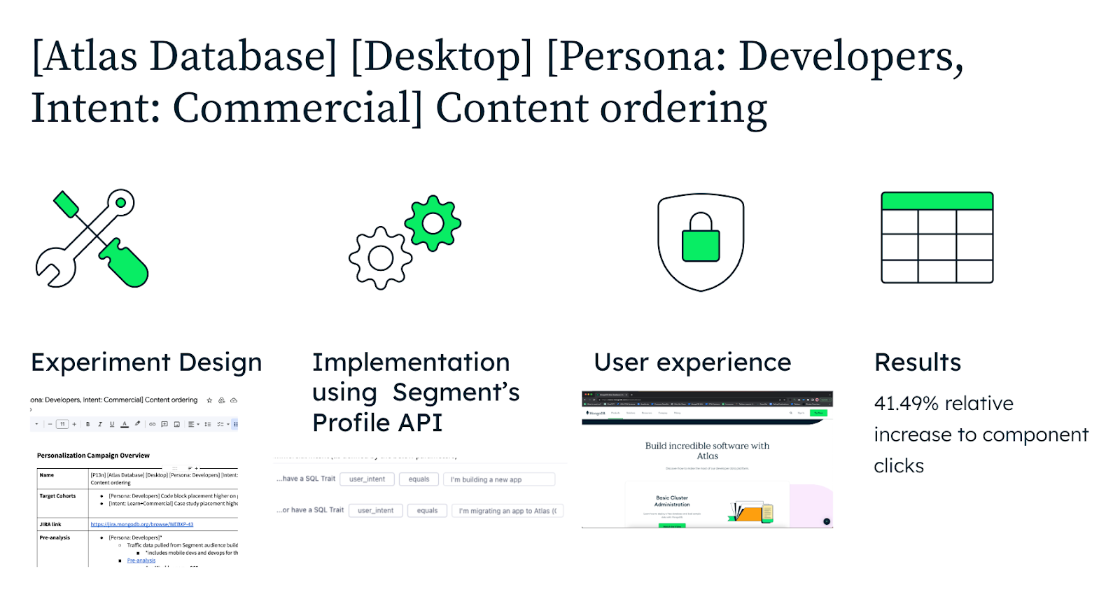 Now, MongoDB can combine multiple data sources in real-time (including event data, valuable analytics and offline data) to form profiles. Profiles are used to target developers with 1:1 messages based on unique needs and behaviors. MongoDB communicates with developers using precise messaging and shares educational content to drive product usage and grow its developer platform.
