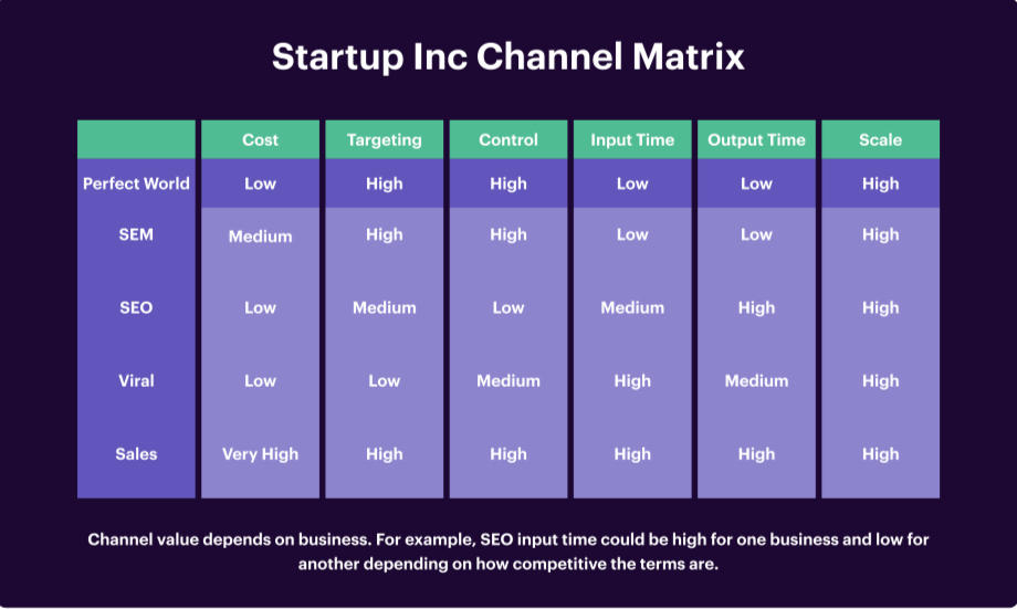 Example of a channel matrix from Brian Balfour’s 5 Steps To Choose Your Customer Acquisition Channel